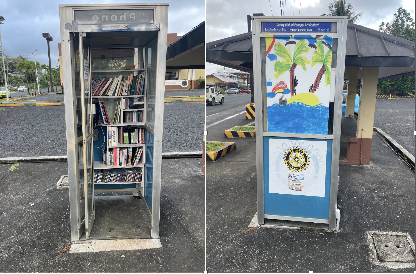 Just then a young woman stepped forward to tell everyone in line that the Rotary Club of Pohnpei was celebrating the opening of its brand-new little free library — you know, one of those give-one, take-one kind of places you see in some local neighborhoods — on the street. Rotary members had built the library in a non-working phone booth in front of town’s telecommunication building. They were also selling beautiful 2025 Micronesian calendars for $5 each.